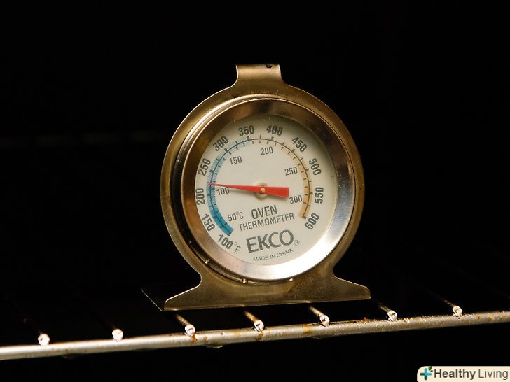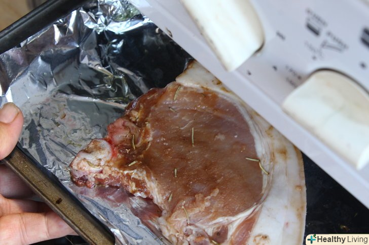 Розігрійте духовку до 220 °C. у духовці повинна бути досить висока температура, щоб м'ясо залишилося пружним і покрилося скоринкою. Перш ніж готувати в духовці м'ясо, попередньо розігрійте її до потрібної температури.[11]- Якщо ви хочете, щоб м'ясо вийшло ніжним і «саме відставало від кісточки", підтримуйте в духовці температуру 150-180 °C. При цьому м'ясо буде готуватися довше.