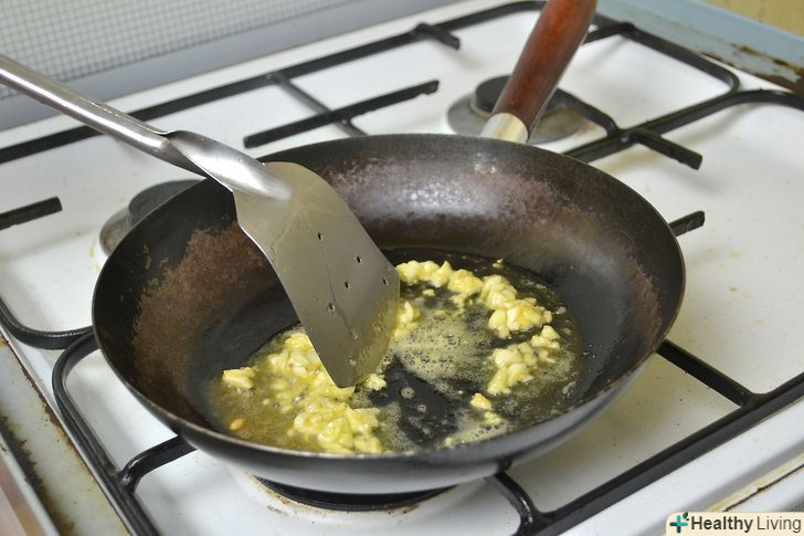 Обсмажте подрібнений часник.додайте часник і готуйте, постійно помішуючи, протягом 1 хвилини. Він повинен стати ароматним і злегка підрум'янитися.- Постійно помішуйте часник в процесі готування. Часник смажиться швидко, і якщо ви не встежите за ним, він може легко підгоріти. Якщо це станеться, зніміть сковороду з вогню, почекайте, поки вона охолоне, викиньте часник і масло і почніть з початку.