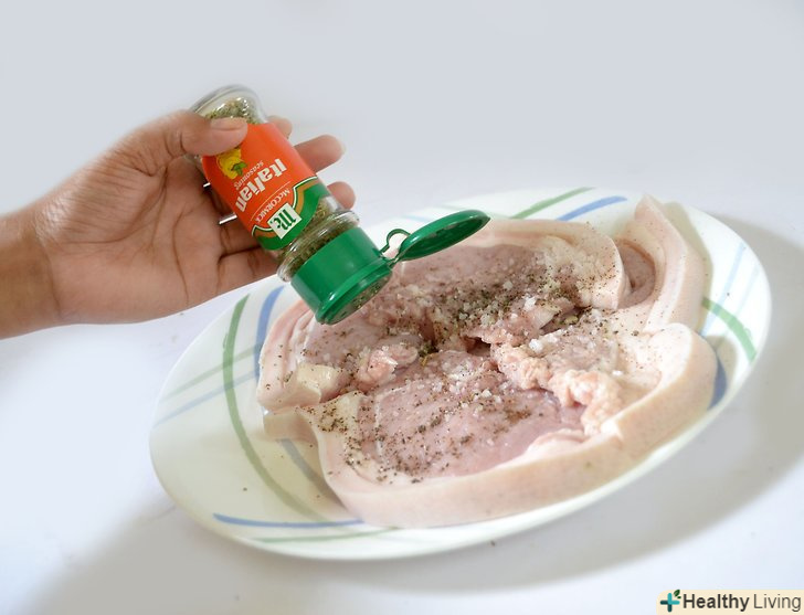 Приправте свинячі відбивні з обох сторін.посипте обидві сторони відбивних рівною кількістю солі, перцю і суміші італійської приправи. Акуратно потріть, щоб спеції проникли в м'ясо.