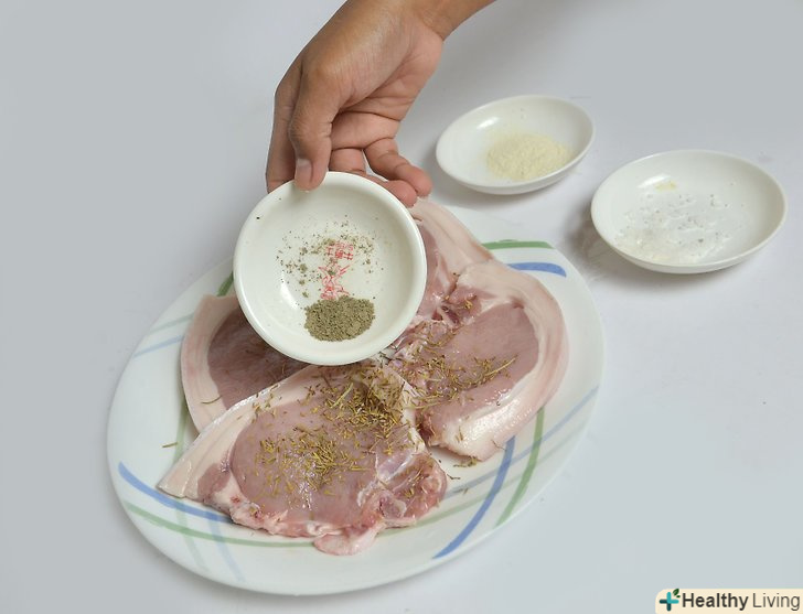 Приправте свинячі відбивні з обох сторін.посипте обидві сторони відбивних рівною кількістю солі, чорного перцю, сушених трав і часникового або цибулевого порошку. Акуратно потріть, щоб спеції проникли в м'ясо.