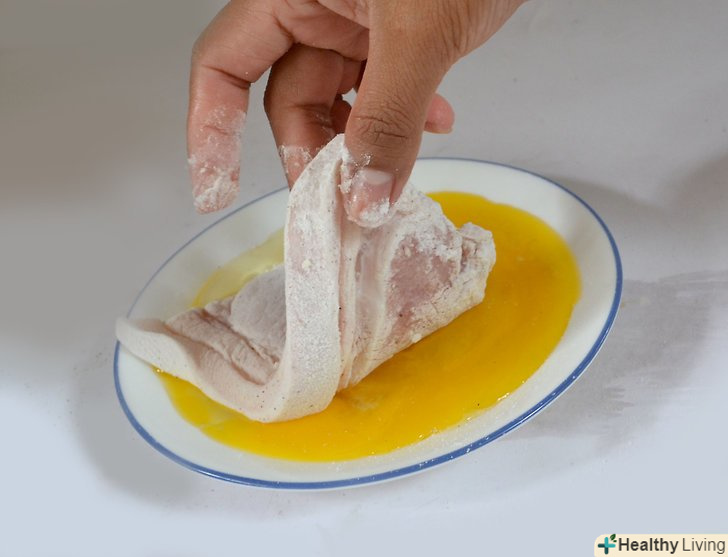 Занурте в яєчну суміш.по черзі занурте кожну відбивну в суміш яйця і пахти. Потримайте м'ясо над мискою протягом декількох секунд, щоб стік надлишок яйця.- Пахта сприяє збереженню соковитості відбивної, а також пов'язує покриття в процесі обсмажування.