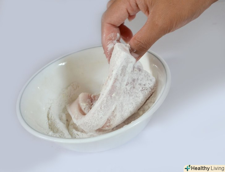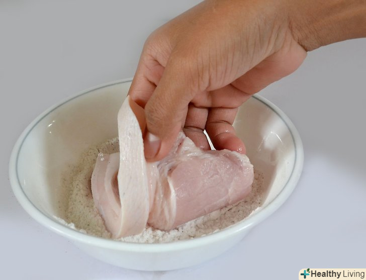 Ще раз покрийте борошном.знову ж таки, по черзі обваляйте кожен шматок м'яса в борошняної суміші і струсіть надлишки.- Це завершальний шар, який після обсмажування стане смачною хрусткою скоринкою. Якщо ви хочете щось ще більш хрустке, обваляйте відбивні в панірувальних сухарях замість борошна, коли наносите завершальний шар панірування.