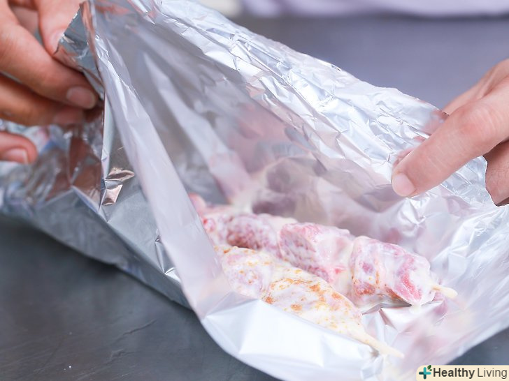 Загорніть м'ясо у фольгу.необхідно покласти м'ясо на лист алюмінієвої фольги для випічки. Зберіть краю і сформуйте мішечок, який не повинен протікати. Так вся рідина залишиться в м'ясі. Поставте мішечок в духовку на деко.