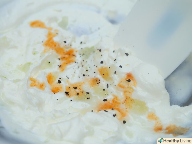 Приправте гострим соусом, сіллю і перцем.додайте бажану кількість приправ і складіть гумовою лопаткою.- Якщо ви не впевнені, скільки використовувати спецій, почніть з 1/2 ч.л. (2,5 мл) солі, 1/2 ч. л. (2,5 мл) перцю і краплі гострого соусу. Спробуйте соус на смак чистою ложкою і відрегулюйте кількість приправ у міру необхідності.