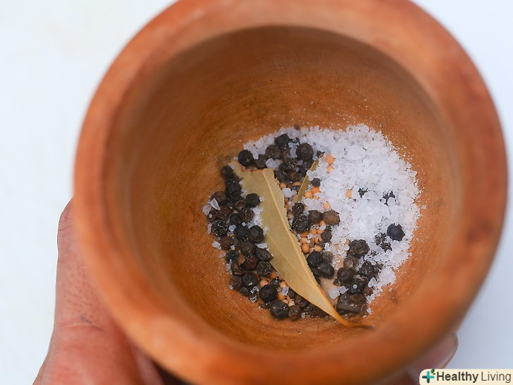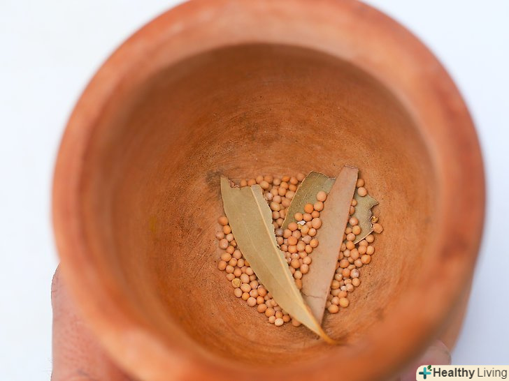 Роздушіть гірчицю, лавровий лист і запашний перець.покладіть насіння гірчиці, лавровий лист і запашний перець в ступку і розітріть їх товкачем.- Якщо у вас немає ступки і маточки, використовуйте ручку молотка для м'яса і невелику миску або що-небудь схоже. Ви також можете покласти спеції в закривається поліетиленовий пакет, закрити його і подрібнити приправи качалкою.
