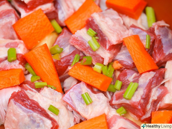 Покрийте селерою і морквою.викладіть селеру і моркву рівномірним шаром на м'ясо.- Це єдині овочі, які необхідно додати на даний момент. Не додавайте капусту. Вона готується швидко і розвалиться, якщо ви її будете готувати весь цей час.
