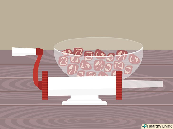 Перекрутіть м'ясо.витягніть м'ясорубку з морозилки і встановіть відповідно до інструкції. Поставте крижану миску під вихід м'ясорубки, щоб збирати фарш. Витягніть м'ясо з морозилки і пропустіть через м'ясорубку на великому або дрібному подрібненні, в залежності від ваших побажань.- Деякі рецепти дають рекомендації щодо крупності подрібнення м'яса, але більшість з них залишає це на розсуд кухаря.
