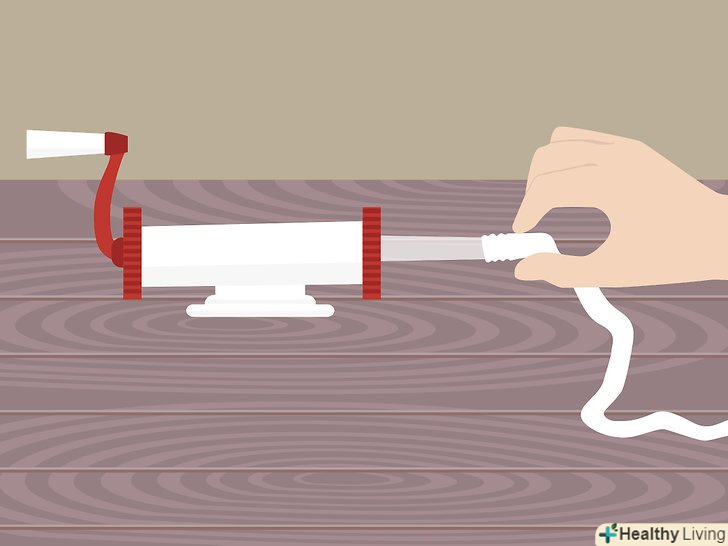 Підготуйте апарат для начинки.витягніть апарат з морозилки і встановіть його згідно з інструкцією. Пропустіть теплу воду через оболонки і підготуйте їх для начинки. Насадіть один кінець оболонок на апарат, залишивши іншу частину розмокати в мисці з теплою водою. Приготуйте холодну тарілку, на яку ви будете класти начинені сосиски. Тільки зробивши все це, дістаньте м'ясо з морозилки.- Коли будете пропускати воду крізь оболонки, перевірте, чи немає протікання. Якщо ви виявите дірку, приберіть цю частину оболонки.[3]