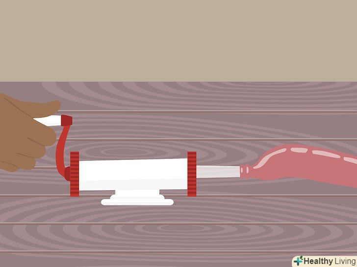 Купіть апарат для начинки сосисок.це ще один необхідний елемент, особливо якщо ви плануєте робити сосиски періодично або регулярно. Начинка фаршу в свинячі оболонки істотно покращує смак сосисок, оскільки в оболонці смак м'яса і маринаду чудово спішуються. Таке абсолютно неможливо без оболонок. Якщо ви впевнені в своїх уміннях і силах, ви можете начиняти оболонки вручну, але майте на увазі, що це дуже складно.- Деякі м'ясорубки йдуть разом з апаратом для начинки сосисок.