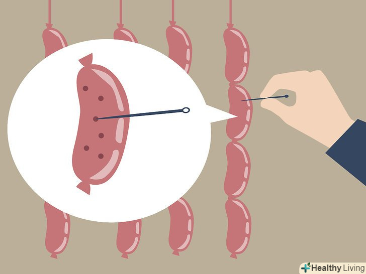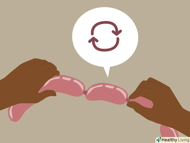 Сформуйте сосиски.тепер у вас повинно вийти кілька довгих начинених м'ясом оболонок. З них вам знадобиться сформувати сосиски. Відміряйте приблизно по 15 см від вузла, стисніть великим і вказівним пальцем оболонку і зробіть три оберти за годинниковою стрілкою однієї перетиснутої частини сосиски щодо іншої.- Відміряйте ще 15 см далі по м'ясному кільцю і, зробивши затиск, на цей раз повертайте проти годинникової стрілки - також три рази. Продовжуйте, поки не обробите весь м'ясний відрізок. Міцно зав'яжіть кінець оболонки.[4]