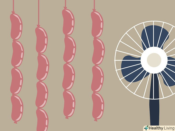 Повісьте сосиски просушитися.підвісьте сосиски на дерев'яну або будь-яку іншу рамку, щоб вони просохли. Вішайте так, щоб сосиски висіли на перемичках, і м'ясом не торкалися рамки. Дайте їм просохнути, залишивши на 1,5 години.