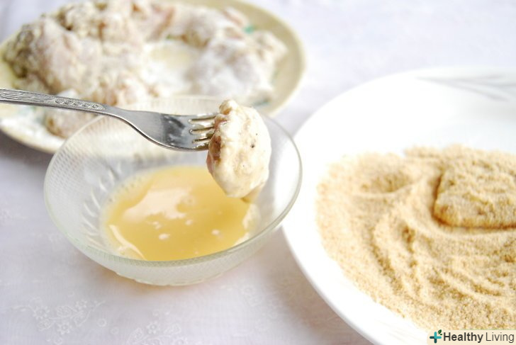 Добре обваляйте шматочок курки в борошні (тисніть на нього, щоб борошно пристала), умочіть в яйце і обваляйте в сухарях.аж до смаження зберігайте в холодильнику.
