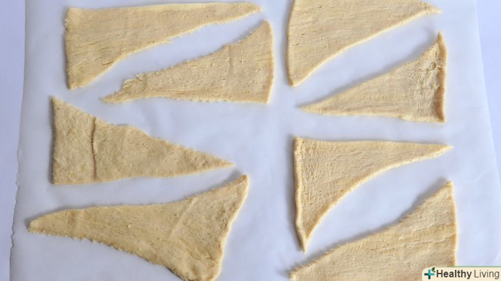Відокремте і розкачайте кожен трикутник тіста для круасанів .тісто має бути не надто товстим і не настільки тонким, щоб ламатися. Майте на увазі, що тісто буде рости і розширюватися в духовці в процесі випікання.