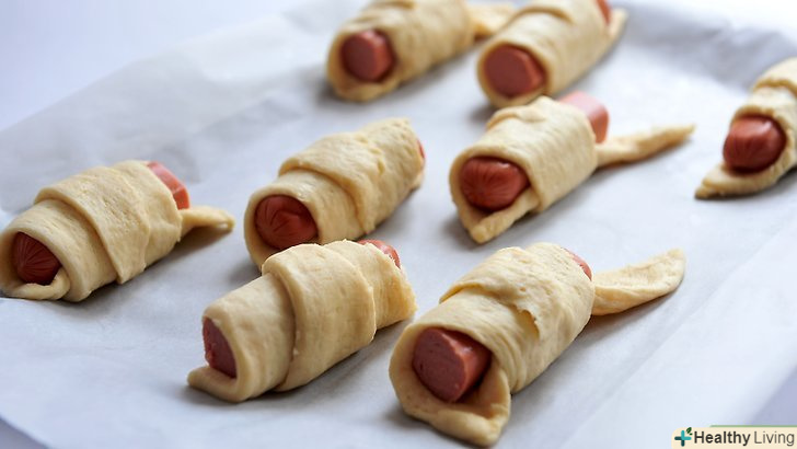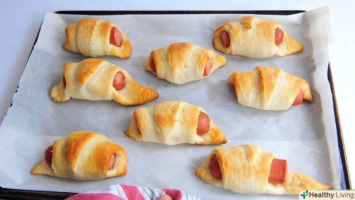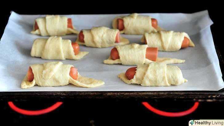 Розламайте або розріжте кожен хот-дог навпіл.покладіть кожну половинку основою трикутника донизу і закатати їх до вершини (від широкої сторони) так, щоб тісто перетворилося в ковдру, обворачивающее сосиску повністю по середині. Віденські сосиски або маленькі ковбаски закручуються цілком, в той час як звичайні сосиски для хот-догів потрібно розрізати навпіл.