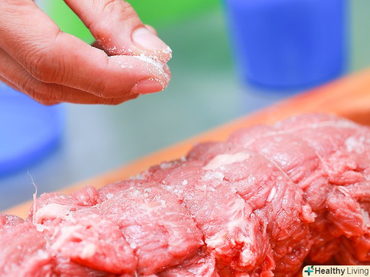 Рясно посоліть вашу вирізку, як мінімум за 40 хвилин або за годину до готування.соління призведе до того, що вся волога з м'яса вийде на поверхню; ось чому не можна солити безпосередньо перед готуванням, якщо тільки ви не хочете приготувати сухе м'ясо.[4][5] у вас не буде цієї проблеми, якщо ви посоліть м'ясо заздалегідь:- Сіль проникає всередину шматка м'яса, якщо ви посолили заздалегідь. Це осмотичний процес (зневоднення).[6] осмотичний процес займає досить багато часу, тому потрібно посолити заздалегідь.