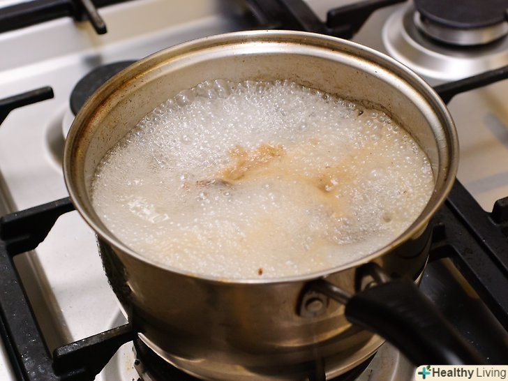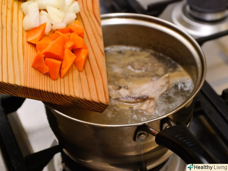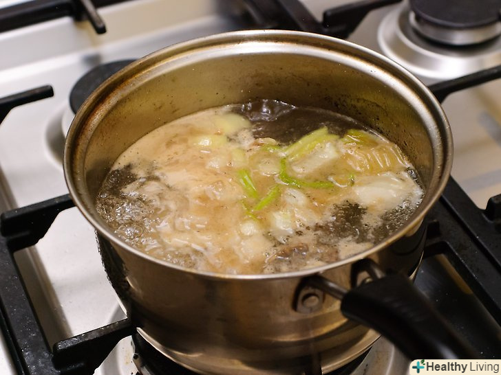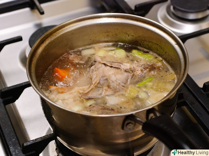 Приготуйте бульйон.залиште рідину злегка кипіти протягом 4 годин. Не накривайте кришкою. Слідкуйте за каструлею, щоб бульйон не втік, і знімайте час від часу піну.[1]