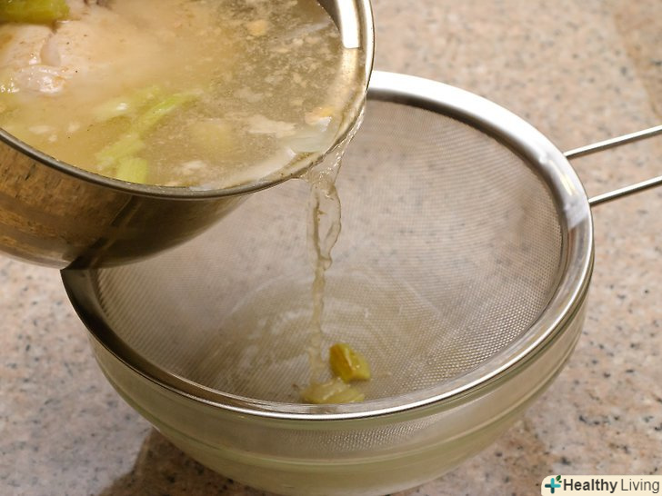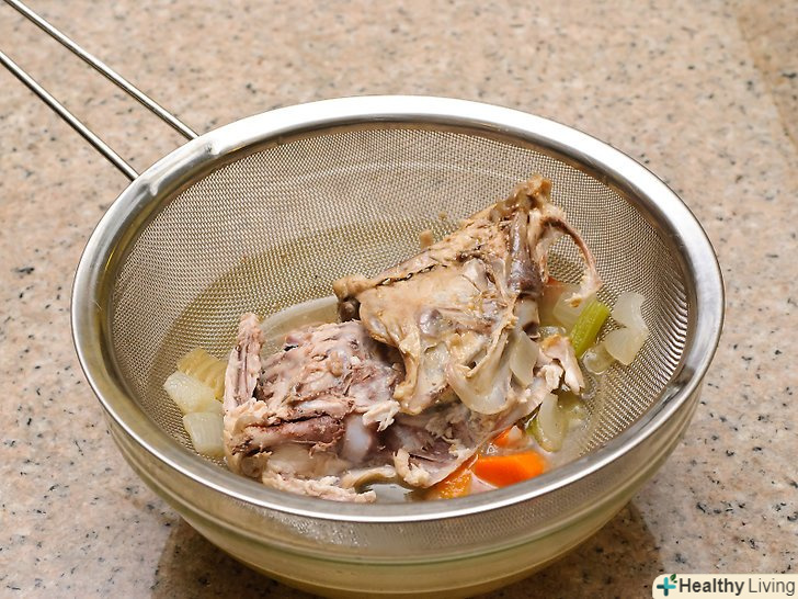 Процідіть бульйон.встановіть на миску великий друшляк і перелийте через нього бульйон, щоб позбутися від кісток і овочів.