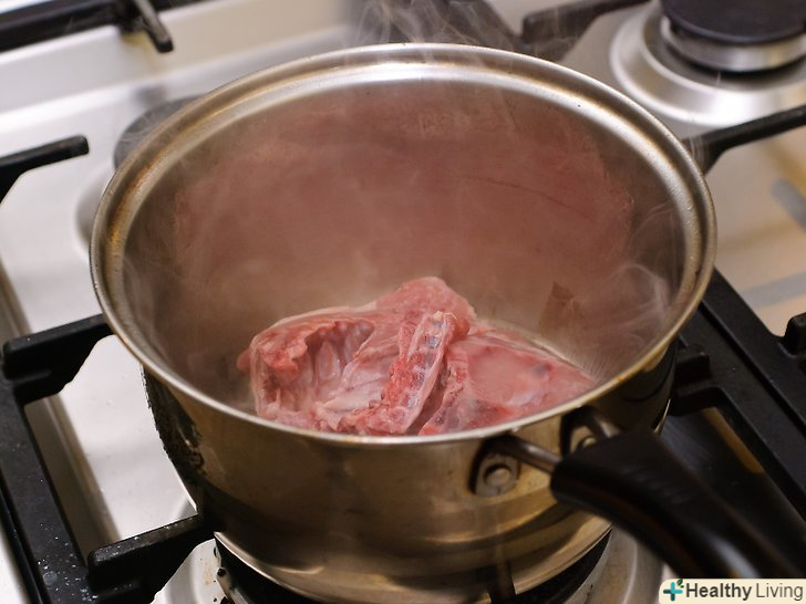 Відваріть кістки.покладіть їх у велику каструлю і цілком покрийте водою (вода повинна не діставати до краю каструлі приблизно 5 см). Поставте каструлю на плиту і включіть сильний вогонь. Доведіть воду до кипіння.