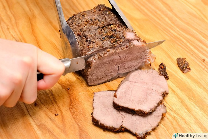 Наріжте тонко.використовуйте обробний ніж і вилку, щоб нарізати пастрами на скибочки по 3,2 мм.- Ви можете використовувати звичайний обробний ніж, але з професійним процес буде швидше.
