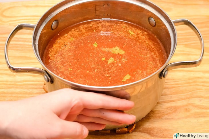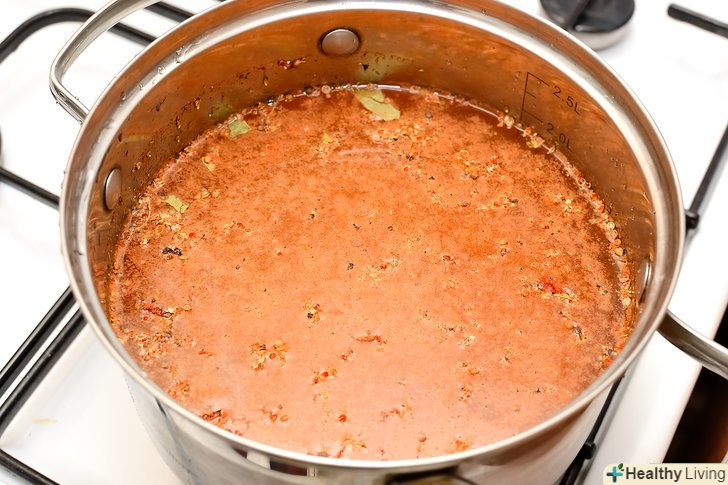 Варіть на сильному вогні.Увімкніть сильний вогонь і варіть інгредієнти розсолу, поки вони не закиплять. Як тільки це станеться, зніміть каструлю з вогню і охолодіть розсіл до кімнатної температури.[2]- Більшість спецій, включаючи сіль, має розчинитися. Процес варіння інгредієнтів сприяє їх ефективному об'єднанню.