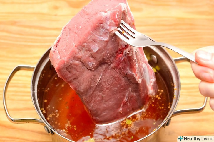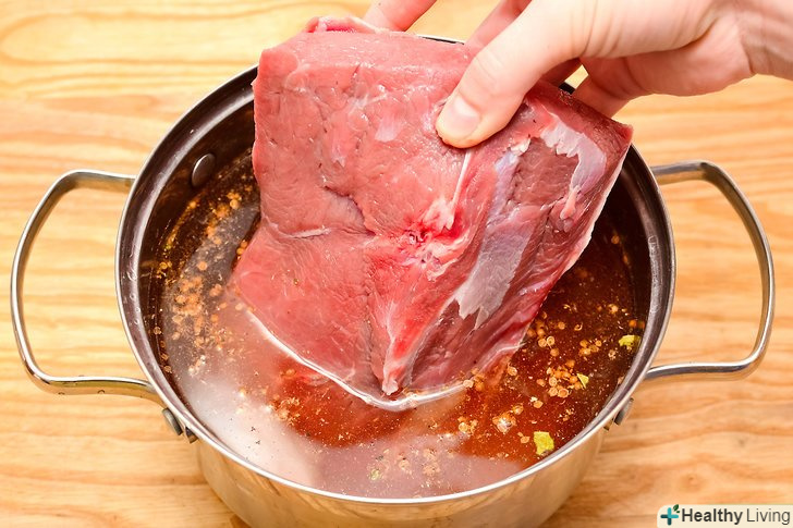Покладіть яловичу грудинку і залиште замочуватися.покладіть грудинку в розсіл, накрийте кришкою і поставте в холодильник на ніч.- Накрийте каструлю кришкою або оберніть поліетиленовою плівкою або алюмінієвою фольгою.