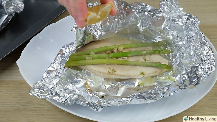 - Покладіть філе тілапії на окремі листи алюмінієвої фольги разом зі спаржею.відірвіть по досить великому листу алюмінієвої фольги для кожного шматочка філе. Розмістіть філе в центрі фольги і покладіть на нього 3-4 втечі спаржі. Загніть краю фольги всередину так, щоб вони утворили бортики.[13]