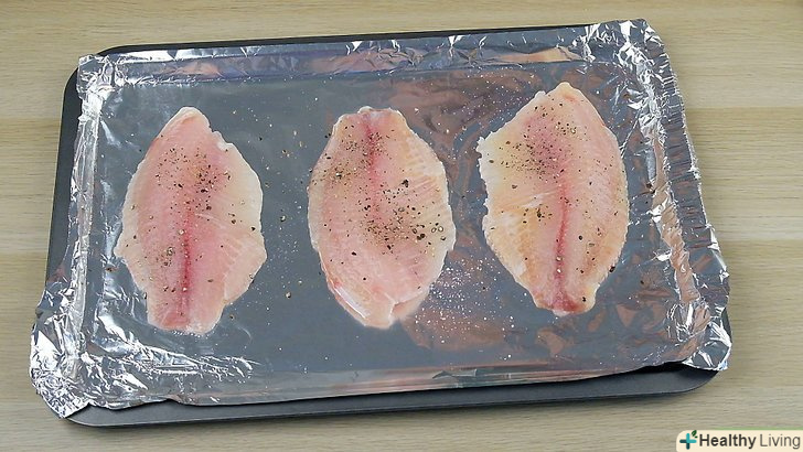 Викладіть тілапію на застелене фольгою деко і посипте її сіллю і перцем.застеліть деко алюмінієвою фольгою, щоб риба не пристала до його дна. Рівномірно розкладіть філе на деку, так щоб між сусідніми шматочками залишалося 2-3 сантиметри. Посипте кожен шматочок філе дрібкою солі і перцю.[20]- Якщо ви не хочете застеляти деко фольгою, побризкайте на нього антипригарним кулінарним спреєм, щоб риба не пристала до його дна.