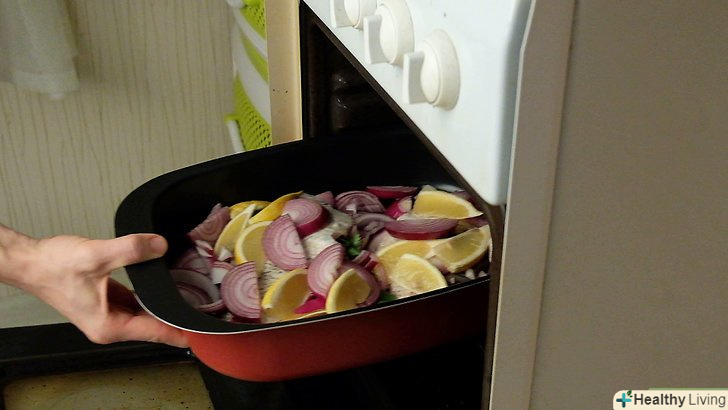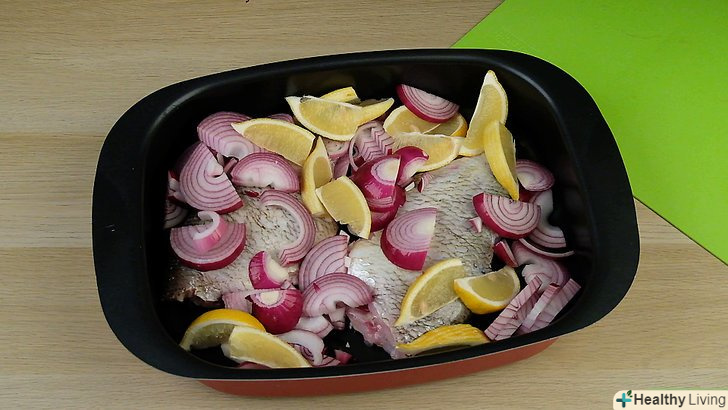 Викладіть рибу на деко разом з скибочками лимона і червоної цибулі.покладіть рибу боком на деко. Якщо ви готуєте кілька риб, розкладіть їх на відстані 2,5–5 сантиметрів один від одного, щоб залишилося місце для ароматних добавок. Заповніть місце, що залишилося скибочками лимона і червоної цибулі — при запіканні вони передадуть рибі свій аромат.[27]- Можна обійтися і без лимона і цибулі, хоча вони набагато поліпшать смак риби.