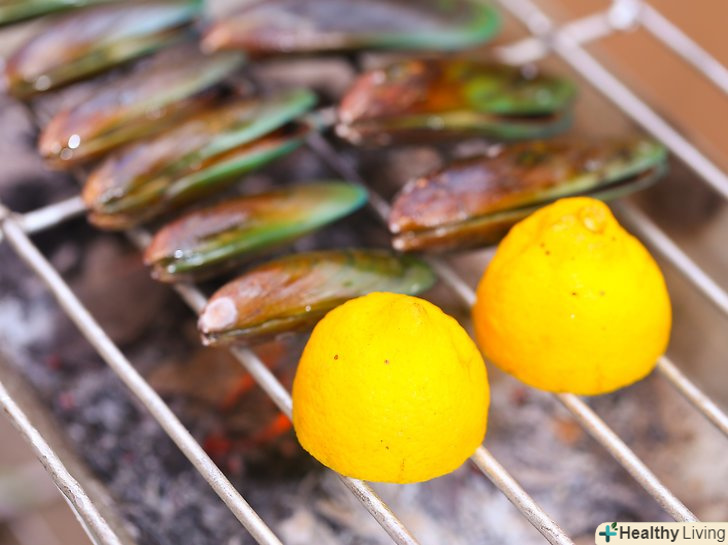 Запікайте мідії на грилі протягом 5 хвилин, до тих пір, поки вони не розкриються.на даному етапі лимони повинні нагрітися і стати злегка коричневими.