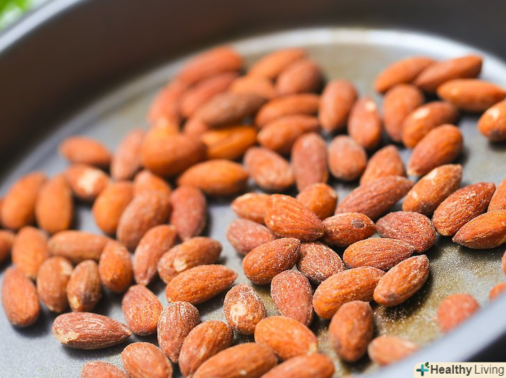 Обсмажте цілі мигдальні горіхи.розкладіть 60 грам цілих мигдальних горіхів на деку рівномірним шаром. Поставте деко в духовку і обсмажуйте їх до тих пір, поки вони не почнуть пахнути, приблизно 5 хвилин.