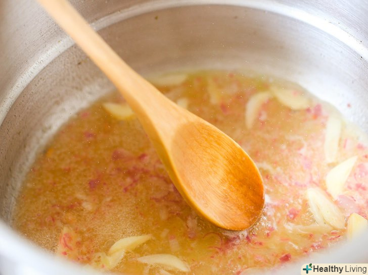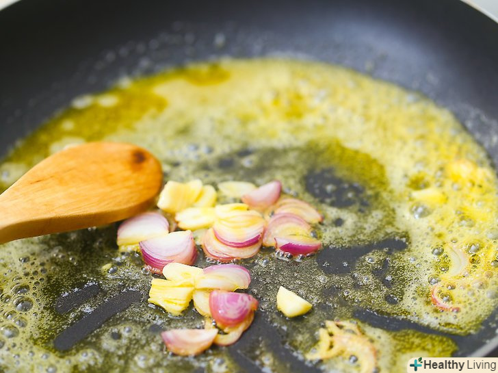 Додайте цибулю-шалот і часник.додайте на сковороду 1 1/2 столові ложки подрібненої цибулі-шалота і 2 зубчики подрібненого часнику, обсмажуйте їх в олії до прозорості, приблизно 2-3 хвилини.