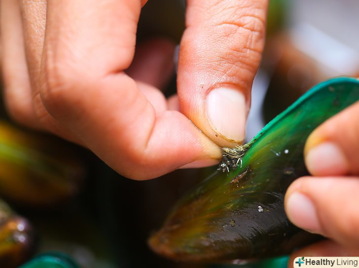 Видаліть волокнисті нитки (бороди ). щоб звільнити мідії від волокнистих ниток, захопіть бороди великим і вказівним пальцями, похитуючи їх з боку в бік, з силою тягніть. Ці нитки не шкідливі і їстівні, просто вони не смачні, так що якщо ви не зможете повністю видалити нитки, нічого страшного. Вам можуть попастися мідії без ниток, не хвилюйтеся, не у всіх мідій вони є. Також волокнисті нитки можна відрізати ножем.[1]