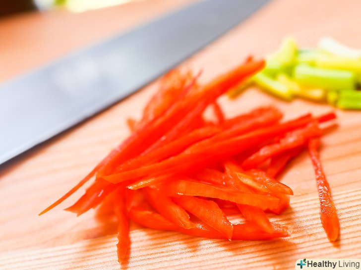Подрібніть 1 червоний болгарський перець.наріжте перець на тонкі смужки.