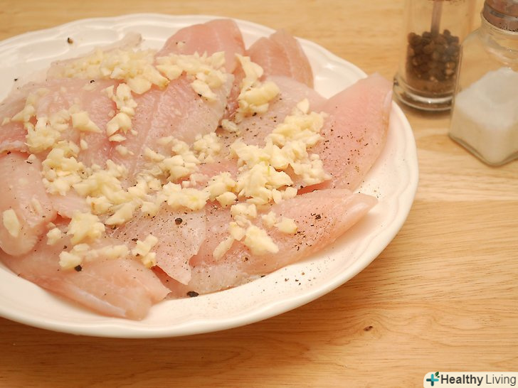 Змастіть маслом і приправте рибу.нанесіть невелику кількість оливкової олії з обох сторін на кожне філе прямо перед приготуванням. Додайте приправи відповідно до рецепту, за яким ви готуєте. Для самого корисного способу нанесіть оливкову олію, а потім посипте рибу сіллю і перцем. Інші прийняті приправи для тиляпії включають:[2]:- Лимон і часник. Змішайте сік лимона з топленим маслом або оливковою олією. Додайте свіжий часник або часниковий порошок до суміші, разом з сіллю і перцем (приправляйте за смаком). Нанесіть суміш з обох сторін на рибу.