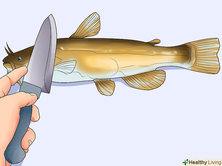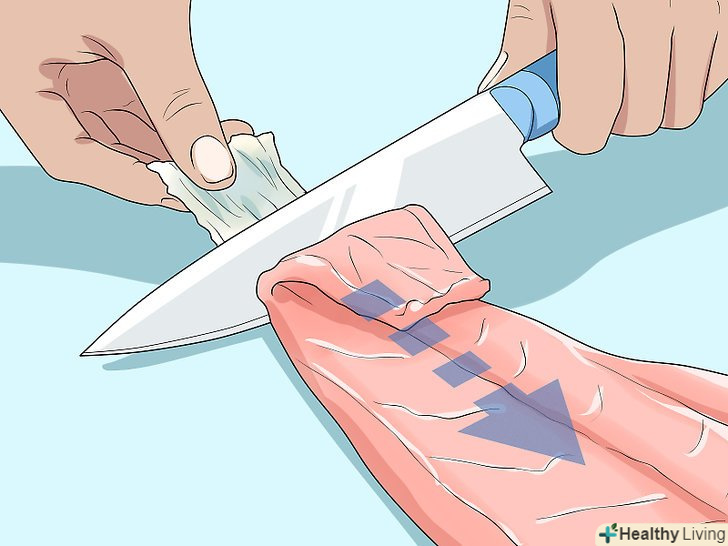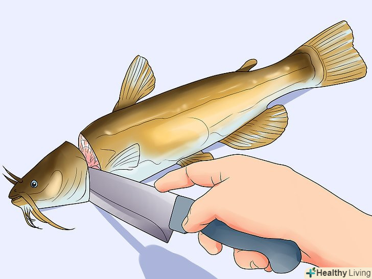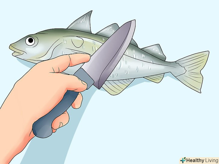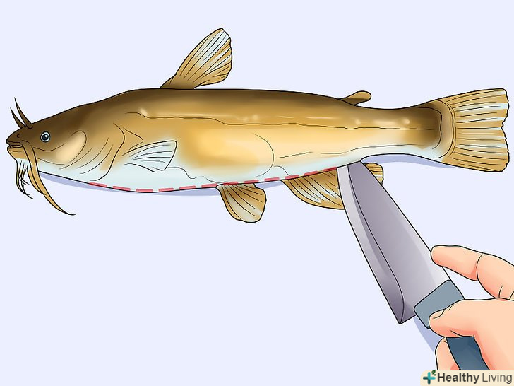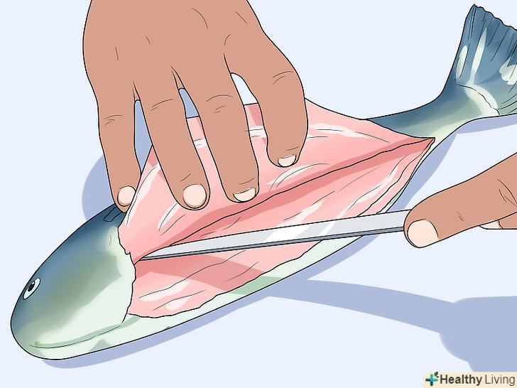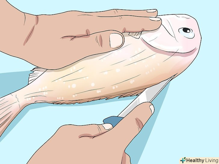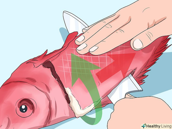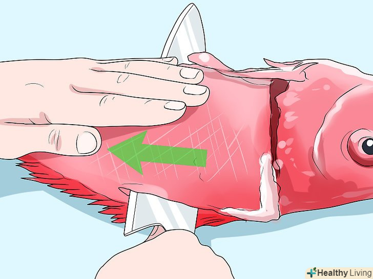 Зніміть луску або зріжте її разом зі шкірою.якщо ви хочете приготувати рибу разом зі шкірою, зчистіть луску тупим боком ножа. Луска легко відривається, якщо робити швидкі, уривчасті рухи, рухаючись від хвоста до голови. Якщо шкіра вам не потрібна, зробіть неглибокий надріз шкіри і зніміть її повністю. [14]