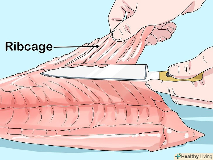 Зніміть ребра з грудної клітини з внутрішньої сторони філе.витягнути грудну клітку можна за допомогою невеликого ножа. Грудні ребра-це ряд невеликих, майже прозорих кісток, які знаходяться в нижній частині рибного філе. Вони відриваються відразу все цілком.[12]
