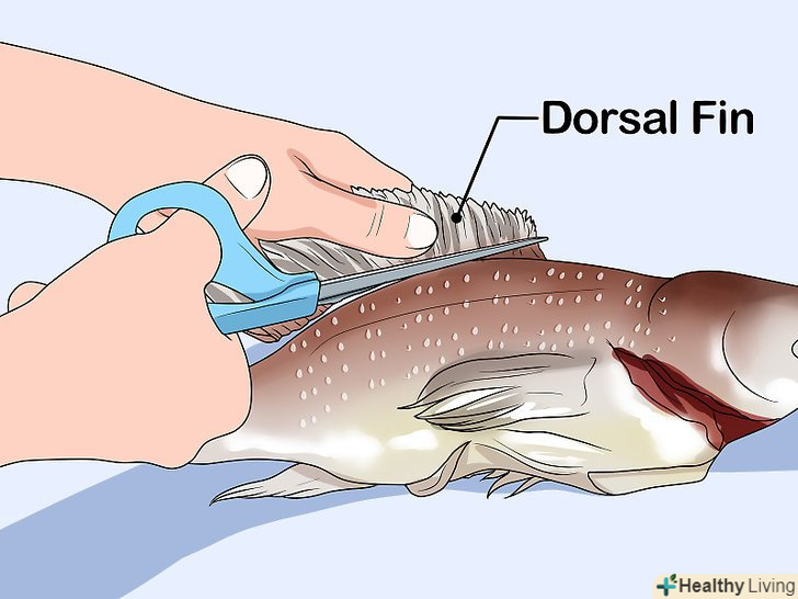 Зріжте спинний плавець, міцно потягнувши його від хвоста до голови.якщо не хочете його зрізати, то це робити необов'язково. Його, як і голову, можна залишити. Плавець зрізають для того, щоб було легше позбутися від дрібних неприємних кісточок. Для цього потрібно міцно взяти плавник з хвоста і різко потягнути в сторону голови, щоб акуратно його зрізати.[8]