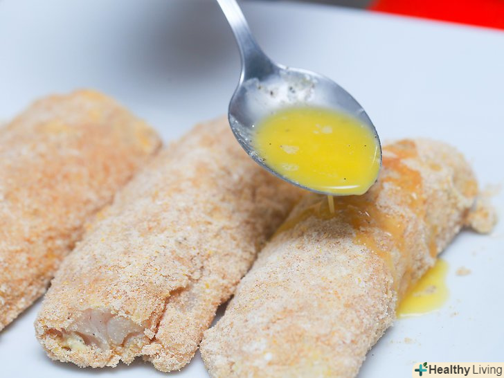 Занурте філе тріски в суміш масла, а потім покрийте рибу сумішшю борошна.масло буде притримувати суміш борошна на рибі. Акуратно струсіть рибу, щоб видалити зайву суміш.