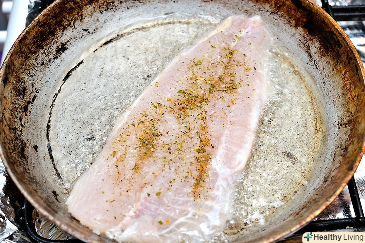 Обсмажте на плиті на сковороді філе морського окуня.- Розігрійте чавунну сковороду на середньому вогні з 2 ст. л. (29.58 мл.) оливкової олії. Оливкова олія повинна диміти, перш ніж покласти в нього рибу.