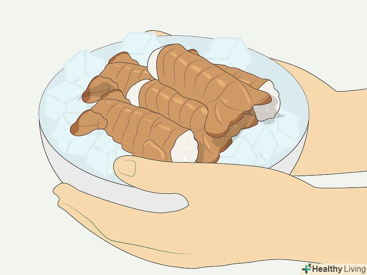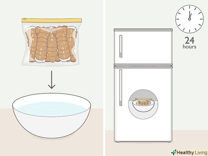 РозморозьтеОмарів .перед варінням цілих омарів, хвостів або клешнів їх необхідно розморозити. Якщо ви не зробите цього, м'ясо може вийти занадто жорстким.[3]- Найкраще розморожувати омарів приблизно протягом доби (або хоча б протягом ночі) перед варінням в холодильнику. Щоб швидше розморозити омарів, їх можна покласти в пластиковий пакет, опустити його в каструлю з водою і поставити її в холодильник. В процесі розморожування бажано хоча б один раз поміняти воду.[4]