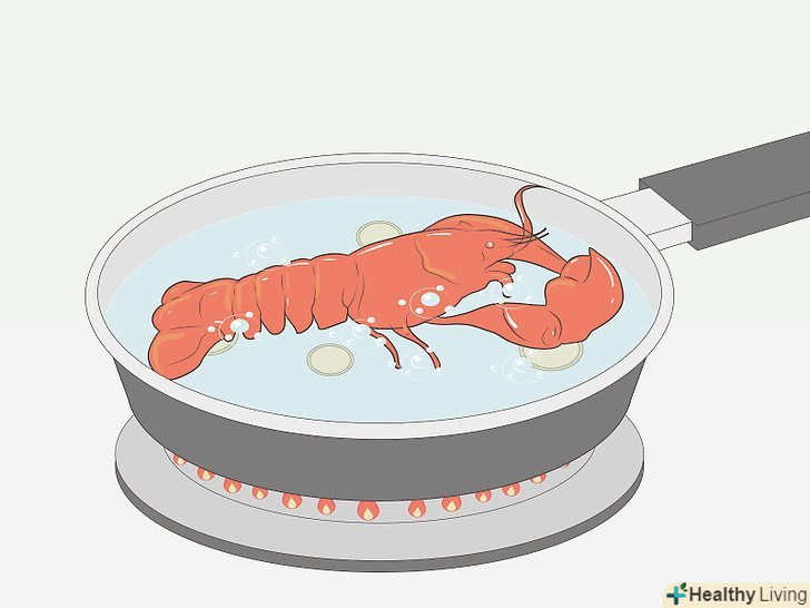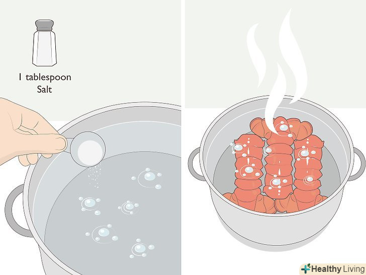 ЗварітьОмарів.варіння у воді є одним з найбільш поширених способів приготування омарів. Налийте воду у велику каструлю і доведіть її до кипіння. У каструлі має бути достатня кількість води, щоб вона повністю покривала хвости омарів.- Додайте 1 столову ложку (20 грамів) солі на кожен літр води. Покладіть розморожені хвости в воду, накрийте каструлю кришкою і варіть омарів в киплячій воді з розрахунку 5 хвилин на кожен хвіст вагою 110-120 грамів (на кожні додаткові 30 грамів ваги додавайте по одній хвилині).
