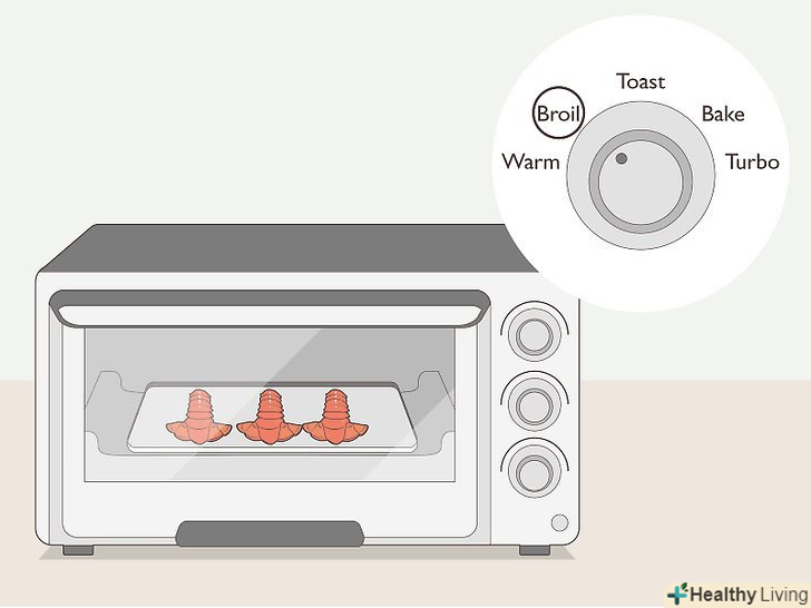 Приготуйте омарів в духовці.виставте в духовці режим смаження. Врахуйте, що жарка займає дуже мало часу, тому уважно стежте за хвостами омарів, щоб вони не пригоріли.- Викладіть хвости омарів на деко. Розмістіть їх панциром вгору і смажте всього лише близько 4 хвилин. Необхідно, щоб м'ясо омарів знаходилося приблизно в 15 сантиметрах від вогню.