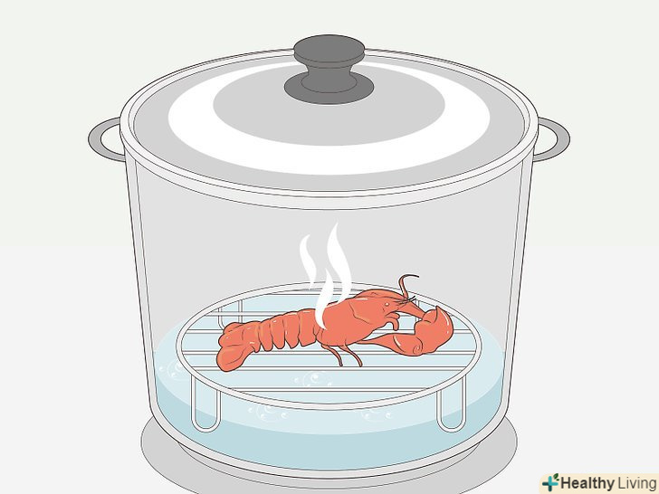 - Щоб зварити омарів на пару, їх можна розмістити також на решітці. Налийте в каструлю трохи води, так щоб вона покривала дно на 5 сантиметрів, доведіть воду до кипіння і покладіть зверху грати з омарами.[9]