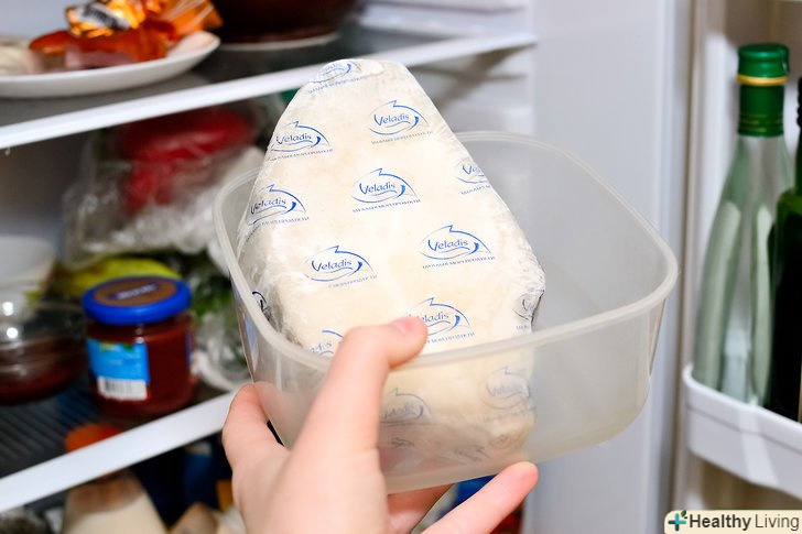 Розморожуйте рибу протягом 8 годин в холодильнику.чим нижче буде температура розморожування, тим менше бактерій буде на рибі. Якщо у вас є час, то залиште рибу розморожуватися в холодильнику на ніч.[7] Температура в холодильнику не повинна перевищувати 8 ºC.- Заморожені продукти при відтаванні випускають багато вологи, тому тримайте рибу в контейнері. Щоб риба не ввібрала багато води в процесі розморожування, зробіть дірки в контейнері або помістіть його в інший контейнер, куди будуть стікати надлишки води.