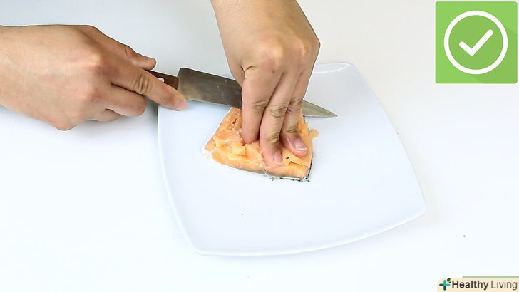Наріжте сьомгу.використовуйте дуже гострий ніж і нарізайте горизонтальні скибочки від верху (не ріжте по вертикалі у вигляді стейка). Граавілохи має яскравий смак і запах, тому більш тонкі шматочки будуть більш апетитними. Сьомга готова до вживання.- Спробуйте рибу на смак. Якщо вона буде занадто солоною, то ще раз промийте її перед нарізкою.