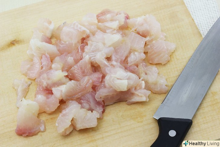 Наріжте кубиками рибу.промийте рибу, насухо промакніте, покладіть на обробну дошку і наріжте гострим ножем на маленькі кубики.