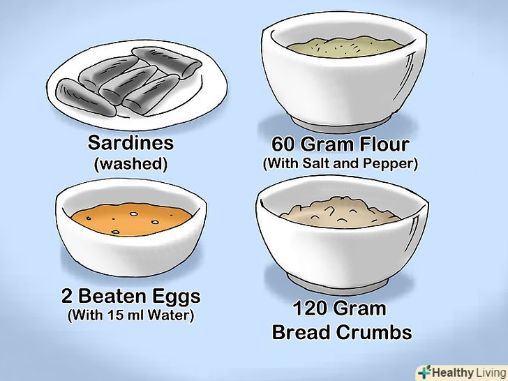 Приготуйте інгредієнти. Сполосніть і висушіть сардини. Насипте в миску ½ склянки (60 г) борошна і додайте сіль з перцем. В іншій мисці збийте 2 яйця і 1 столову ложку (15 мл) води. У ще одну миску насипте 1 стакан (120 г) панірувальних сухарів.[11]