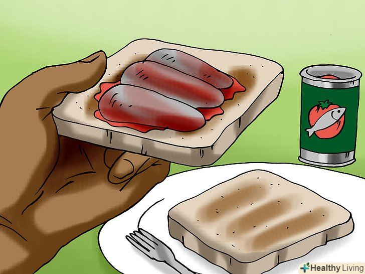 Подайте їх на тості.солоний і насичений смак сардин-ідеальне доповнення до хрусткого хліба. Підсмажте скибочку улюбленого хліба, змастіть його маслом і покладіть зверху кілька сардин. Або ж намажте тост майонезом, покладіть зверху сардини і посипте їх дрібкою кропу.[3]