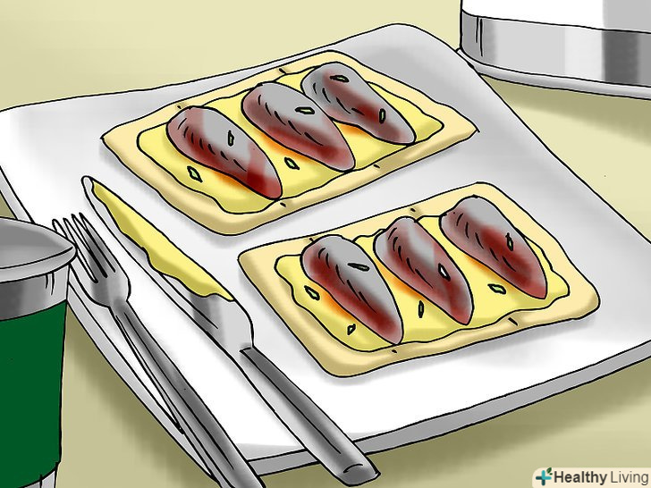 Приготуйте закуску на крекерах з сардинами.Візьміть свої улюблені крекери і заправте їх сардинами. Якщо ви віддаєте перевагу гострі закуски, додайте зверху трохи гострого соусу! Крім того, перш ніж додавати сардини, на крекер можна намазати майонез або гірчицю.[4]