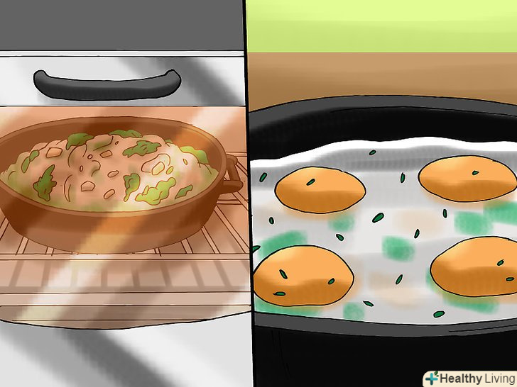 Готуйте 6 хвилин, а потім витягніть блюдо і додайте яйця.поставте блюдо в духовку і запікайте його 6 хвилин. Прихватками акуратно витягніть блюдо з духовки. Розбийте в миску 4 яйця і вилийте їх на блюдо. Приправте яйця сіллю і перцем.[9]